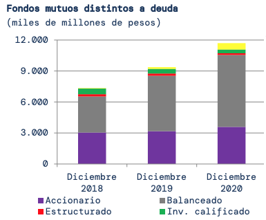 A diciembre de 2020, el patrimonio promedio efectivo total administrado por la industria de fondos mutuos fue $51.304 mil millones2 (US$ 68.832 millones), lo cual implicó un aumento de 13,9% respecto al mismo periodo del 2019. El número de partícipes fue 2.650.153. En tanto, el número de alternativas disponibles se ubicó en torno a las 2.900.